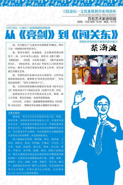 民族精神是中华民族赖以生存、共同生活、共同发展的灵魂,贵在弘扬,重在培育。以爱国主义为核心的民族精神是社会主义核心价值体系的精髓之一,为进一步弘扬民族精神,提升文化素养,近期“工院论坛——文化素质教育系列讲座”邀请到著名作曲家、电视导演、河北大学艺术学院音乐系主任蔡海波教授,为我们带来《从〈亮剑〉到〈闯关东〉——优秀电视剧主题歌鉴赏》主题讲座。