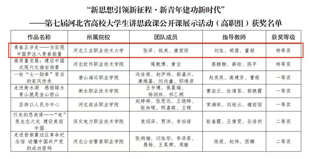 近日,河北省教育厅公布了“新思想引领新征程·新青年建功新时代”—第七届河北省高校大学生讲思政课公开课展示活动(高职组)获奖名单。我校马克思主义学院教师教师刘佳、胡蓉、董超指导,学生张泽、钱爽、康宸雨主讲的作品《青春正步走——为实现中国梦注入青春能量》荣获全省高职组特等奖。
