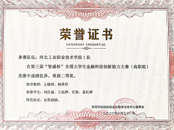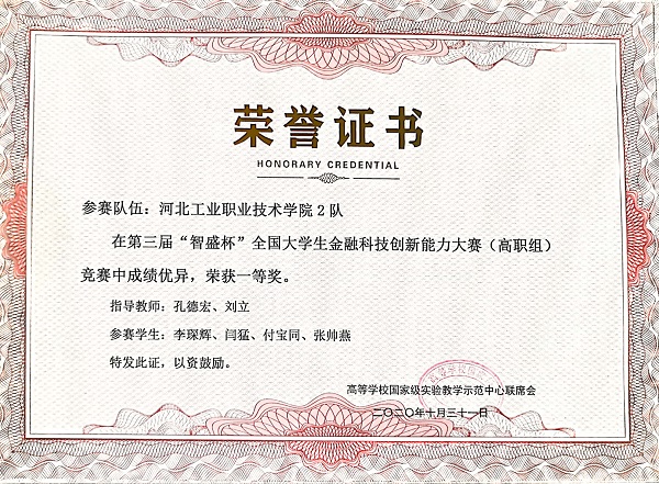 2020年10月31日,在第三届“智盛杯”全国大学生金融科技创新能力大赛全国总决赛中,我院工商管理系金融专业派出的两支代表队分别斩获一等奖、二等奖,为我院再创佳绩。