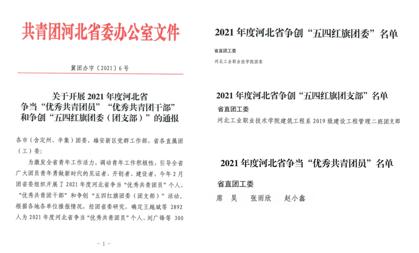 近日,共青团河北省委下发的《关于开展2021年度河北省争当“优秀共青团员”“优秀共青团干部”和争创“五四红旗团委(团支部)”的通报》中,我校团委获得“河北省五四红旗团委”荣誉称号。建筑工程系2019级建设工程管理二班团支部被评为“河北省五四红旗团支部”,我校三名学生获“河北省优秀共青团员”称号。