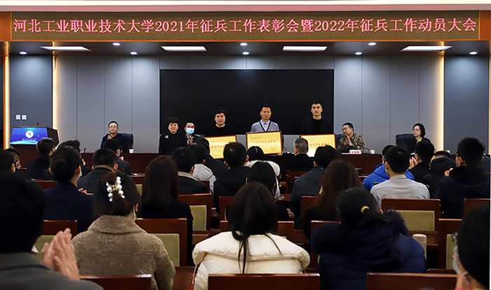 为全面总结2021年征兵情况,部署2022年征兵工作,12月8日上午,我校在办公楼五楼报告厅召开2021年征兵工作表彰暨2022年征兵工作动员会。校党委副书记付俊薇,桥西区区委常委 人武部政委杜国庭、部长杨宇彤出席会议。