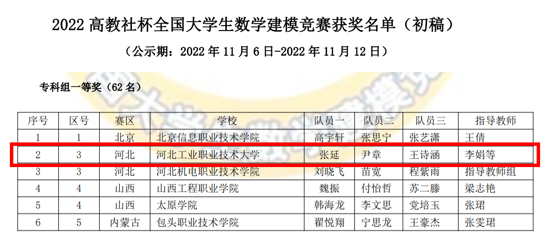 近日,由教育部高等教育司、中国工业与应用数学学会共同举办的2022年“高教社杯”全国大学生数学建模竞赛成绩揭晓,我校学生张延、尹章、王诗涵在本次比赛中斩获全国一等奖,实现了我校在此项竞赛中的新突破。