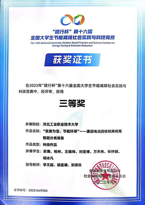 近日,由教育部高等学校能源动力类专业教学指导委员会指导,全国大学生节能减排社会实践与科技竞赛委员会主办的“建行杯”第十六届全国大学生节能减排社会实践与科技竞赛决赛落下帷幕,我校“变废为宝、节能环保——废旧电池回收和再利用智能分类装备”项目荣获国赛赛道三等奖。