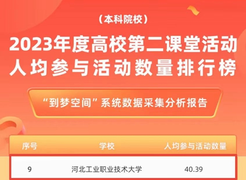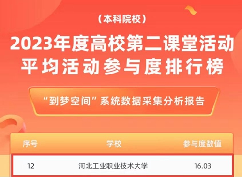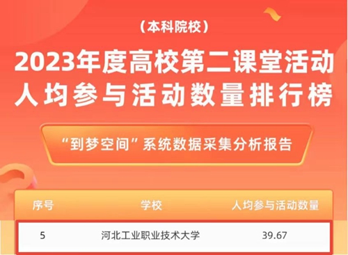 近日,共青团“第二课堂成绩单”网络管理系统(到梦空间)以六个维度推出全国高校第二课堂年度榜单,我校在第二课堂人均参与活动数量、第二课堂人均获得成长记录数量、第二课堂活动平均活动参与度三个维度分列全国第5、9、12名,入选到梦空间年度榜单50强高校。