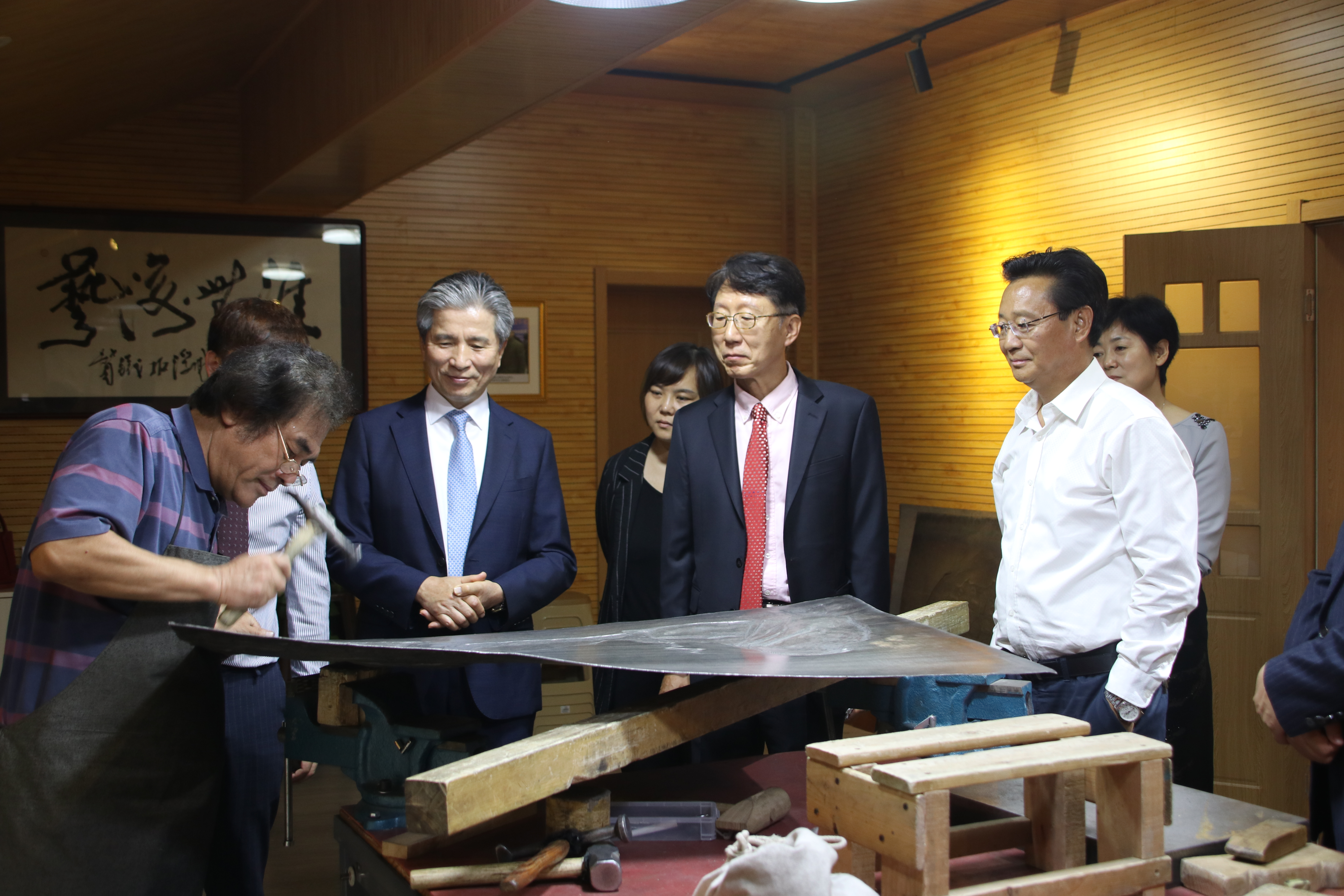 来宾参观铁板浮雕艺术工作室