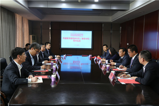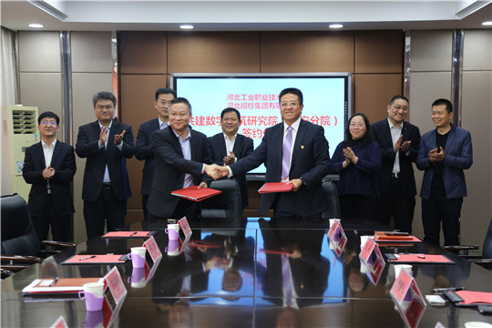 4月29日下午,河北工业职业技术学院与河北招标集团有限公司共建河北省数字建筑研究院(雄安分院)签约仪式在我院举行。河北招标集团有限公司党委书记刘华民、总经理张杰、学院院长贾俊礼、副院长韩提文出席签约仪式,学院应用技术研发中心、建筑工程系相关负责人等参加签约仪式。
