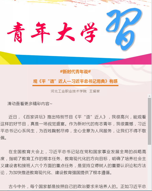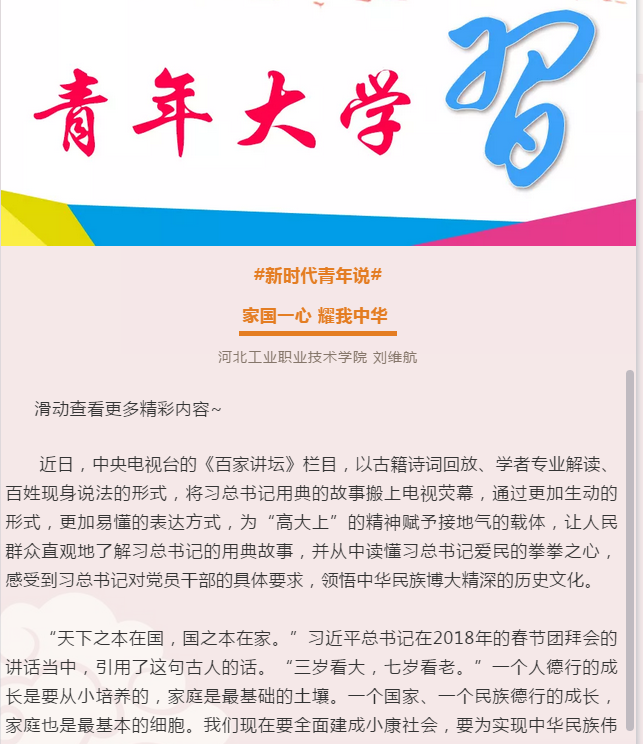 为深入推进学习宣传贯彻习近平总书记系列重要讲话精神“四进四信”活动,发挥大学生理论学习社团的优势及作用,引领青年学生加强对讲话精神的系统领会和广泛传播,近日,我院“明德书院”组织2018级书院新生观看了由中共中央宣传部、中央广播电视总台联合创作的《百家讲坛》特别节目《平“语”近人—习近平总书记用典》。同学们在观看并感受了这场精神盛宴后,颇具感慨,每人认真积极撰写观后感并投稿,其中汽车工程系刘维航同学的《家国一心,耀我中华》、王留家同学的《平“语”近人——习近平总书记用典有感》,被团中央学校部相继转载。