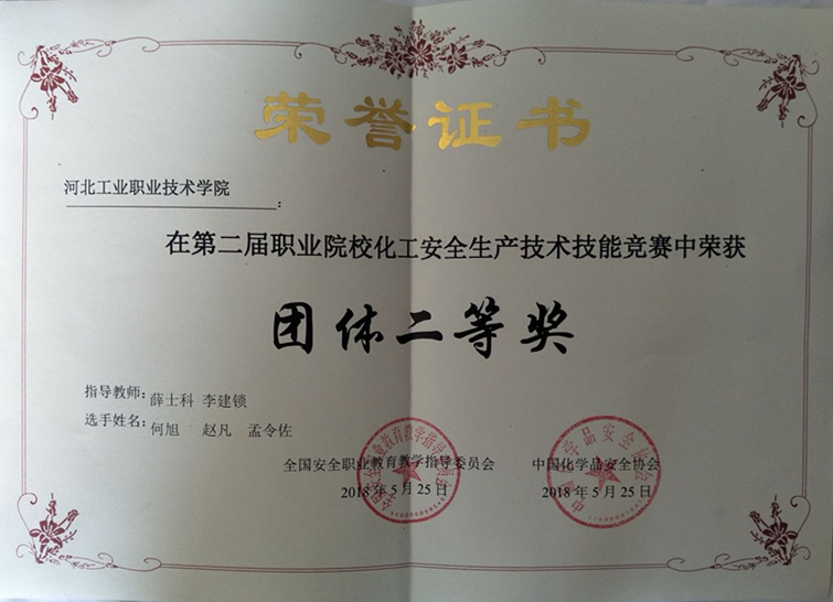 5月22日至24日,由全国安全职业教育教学指导委员会、中国化学品安全协会主办的全国职业院校化工安全生产技术技能竞赛在秦皇岛博赫科技开发有限公司开赛。来自全国20个省、自治区、直辖市的45支队伍参加了比赛。我院派出由环境与化学工程系薛士科、李建锁老师指导的学生代表队,经过激烈角逐最终荣获大赛团体二等奖。
