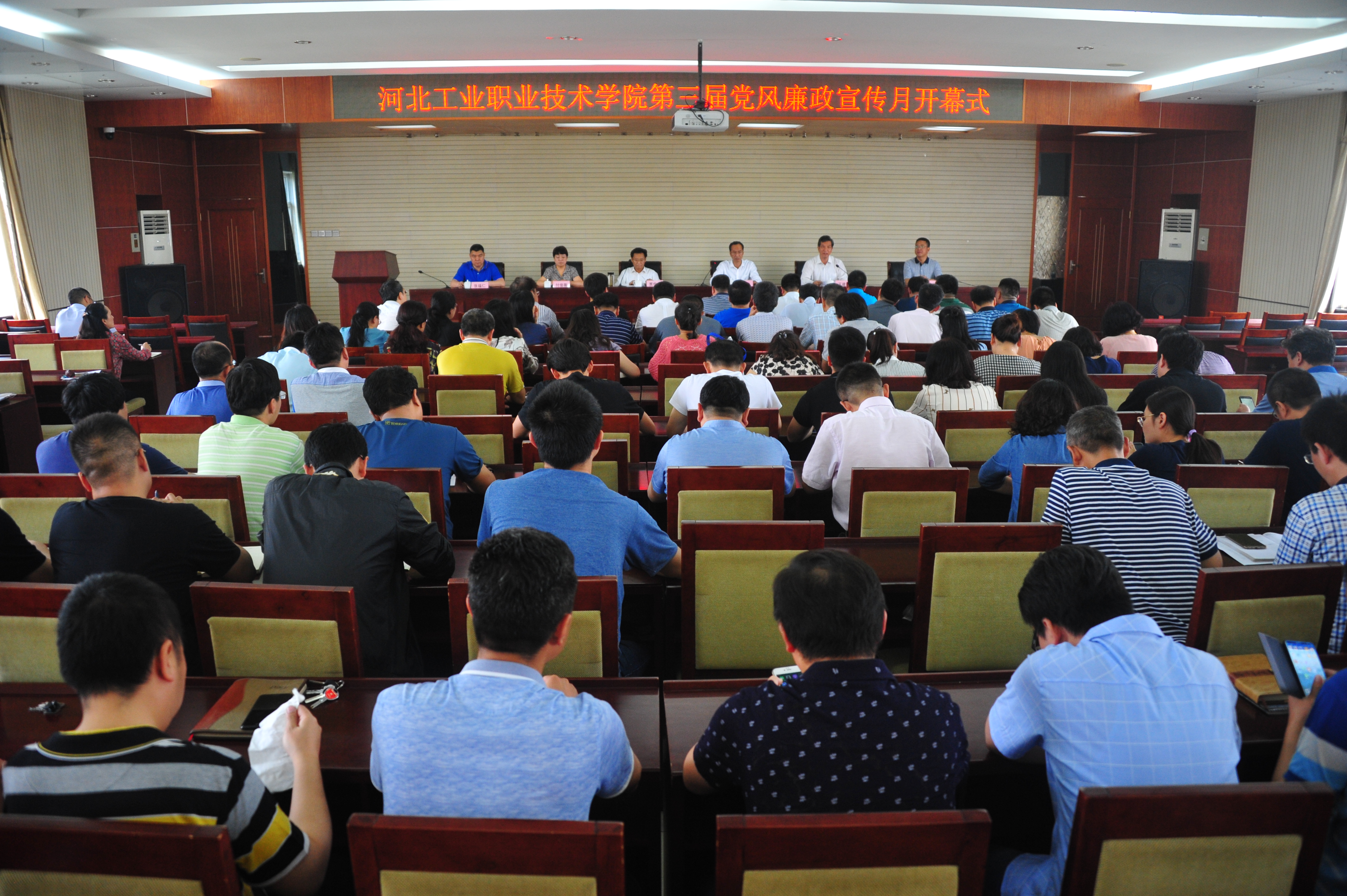 会议对学院2018年党风廉政宣传月活动进行全面动员和部署。开幕式上,院长贾俊礼宣读《河北工业职业技术学院第三届党风廉政宣传月实施方案》,明确本届党风廉政宣传月的主题是“做廉洁自律表率 促学院双高建设”,并就举办“砥砺奋进 再铸辉煌”党的十九大宣传展、“不忘初心 牢记使命”党的十九大知识竞答、“清风廉韵”廉政诗歌散文诵读及廉政专题讲座等系列宣传教育活动做出具体安排部署。