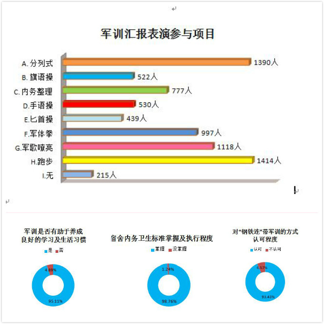 2017年新生军训工作已圆满结束,经过对全体新生详细的问卷调查,发放问卷5802份,回收率100%。调查结果显示,新生表示对本次军训的满意度达到95%以上,对良好习惯养成度达到98%以上,90%以上的新生表示对军训自训模式表示认可,并对教官的训练表示满意。长期以来,河北工业职业技术学院鼓励学生将个人发展和国家战略需求紧密结合,把论文写在祖国大地上。学校不断将基础研究、前沿探索等领域优势,转化为创新国防教育的新模式。如何将学院的专业优势、科研优势,转化为一线思政教师的育人优势,是我们不断思考的命题,我们希望通过专业第一课堂与军训第二课堂的深度融合,为学院“大思政”格局构建提供支撑,实现立德树人润物无声的目标。