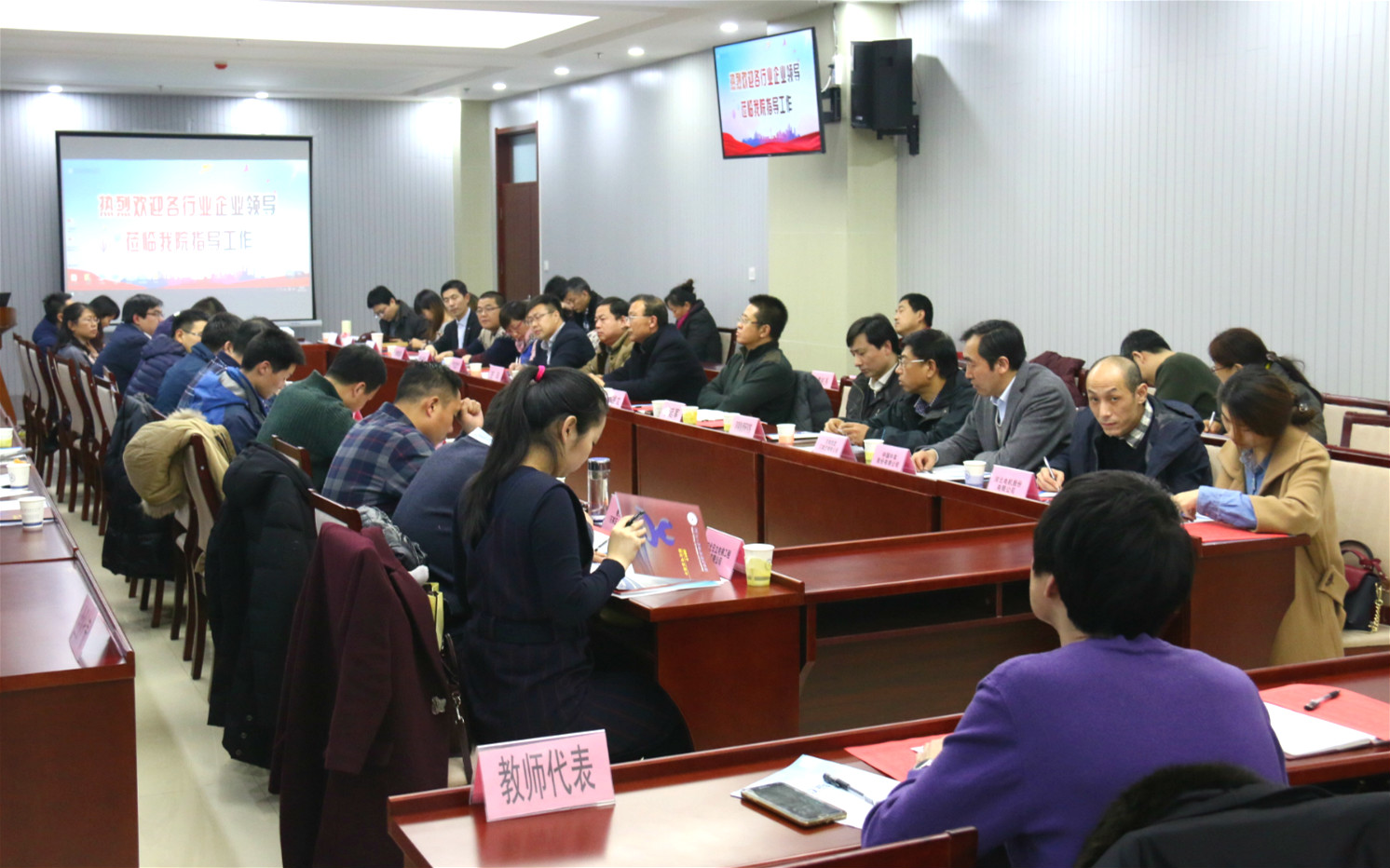 随后,招生就业指导中心(校企合作处)负责人就学院近几年生源质量、生源结构、专业群人数、就业服务与指导、市场建设、就业分析、校企合作模式等方面情况进行了详细介绍。各企业代表介绍了各行业企业目前发展现状、未来企业用工需求情况,并对学院人才培养、教育教学、专业设置、校企合作等方面提出了宝贵的意见和建议。