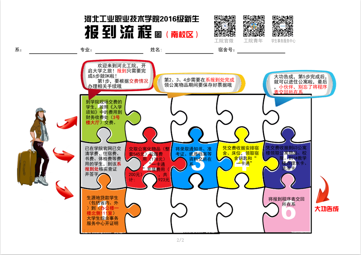 新同学、新学期、新希望。9月10-11日,5000余名新生将怀揣青春梦想,走进色彩缤纷的河北工院。学院认真安排,精心准备,迎新工作已全面就绪,静候新生及家长的到来。