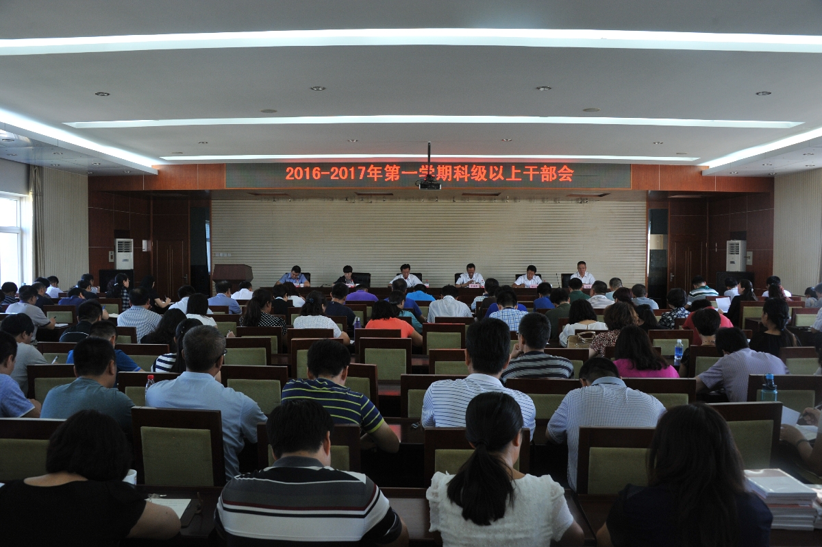 9月2日上午,我院在南校区五楼报告厅召开2016年下半年新学期科级以上干部大会,安排部署2016年度下半年工作。会议由党委书记王振杰主持,学院院长贾俊礼、副书记、纪委书记郭社军、副院长付俊薇、韩提文、张福仁出席会议,全体科级以上干部参加大会。