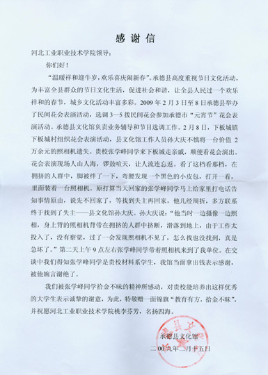 经过多方联系,张学峰终于找到了失主所在单位——承德县文化馆。原来,县文化馆工作人员孙大庆负责花会表演业务辅导和节目选调工作,当时正忙于摄像,装有照相机的皮包背在身后,背带在人群中被挤断,皮包滑落掉地而丝毫没有察觉,当发现照相机丢失时心里万分焦急:照相机价值两万多元,相机内保存的大量珍贵照片资料尚未提取!第二天上午,张学峰来到县文化馆,将照相机送到了失主手中,当工作人员激动地取出现金表示感谢时,却被张学峰婉言谢绝了。
