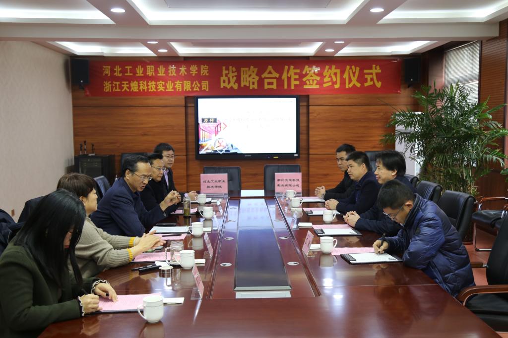 12月13日,我院与浙江天煌科技实业有限公司战略合作签约仪式在北校区行政楼会议室举行。浙江天煌科技实业有限公司董事长黄华圣、副总经理高华平、我院党委书记王振杰、院长贾俊礼、常务副院长付俊薇及环境与化学工程系负责人出席了签约仪式
