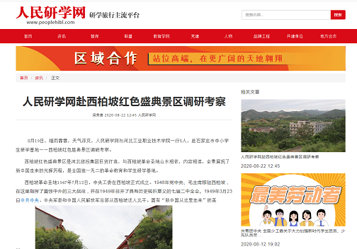 2020年8月19日,河北工业职业技术学院一行5人与人民日报社《人民周刊》相关负责人共赴我院工商管理系旅游管理专业实习基地——西柏坡红色景区调研考察。