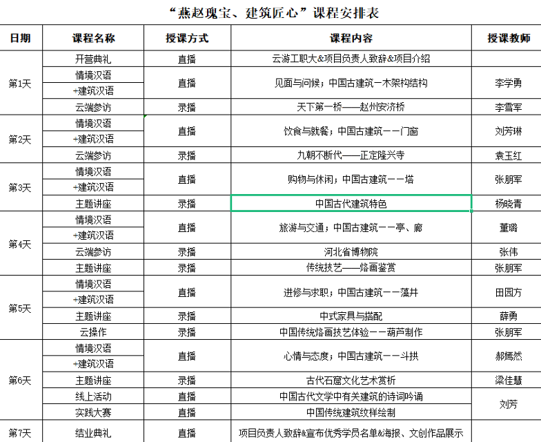 本项目是我校“汉语桥”线上团组项目之一,“燕赵瑰宝、建筑匠心”项目以“学中文、学古建、知中国”为主题,交流内容涵盖中国建筑、艺术、历史、民俗、文学等方面,以线上直播、录播、云端参访、云操作等多种方式展示中华文化的博大精深和燕赵文化的独特魅力。有来自巴基斯坦、越南等国家的84名青年学生参加了本项目。