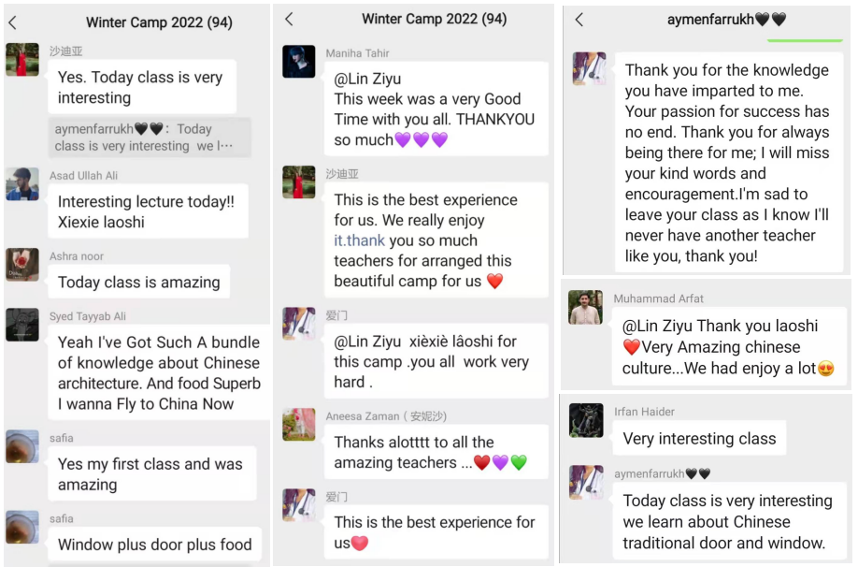 项目设计立足外国学生需求,精心打磨培训内容。教师备课充分、授课生动,学员管理有序,丰富的教学内容、精彩的直播课堂和录播课程激发了学员浓厚的学习兴趣。学员们被灿烂的中华文化、独特的燕赵建筑文化和非遗文化深深吸引,期待有机会来中国真切地感受中国文化的魅力,领略燕赵地域的独特风貌。学员以视频、手绘、文字等形式认真完成并提交了各项作业。在结营仪式中,学员们纷纷通过短视频形式表达了对本次“汉语桥”项目的感想、感谢和感悟,并对项目的课程安排和授课教师给予了高度评价。