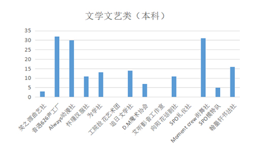 文学文艺类社团本科纳新人数173人,占文学文艺类社团纳新人数的27%。排名前三最受本科生欢迎的文学文艺类社团是音遇626声工厂、Momentcrew街舞社、Always动漫社。