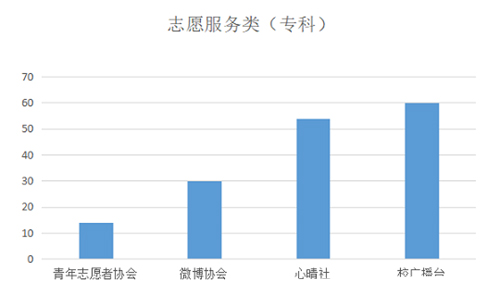 志愿服务类社团专科纳新人数158人,占志愿服务类社团纳新人数的60%,排名前三最受专科生欢迎的志愿服务类社团是校广播台、心晴社、微博协会。