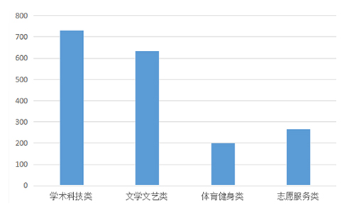 四类社团中,学术科学类社团加入的新生人数最多,共730人占纳新总数的39.8%。其次是文学文艺类社团,纳新人数共634人,占纳新总数的35%。