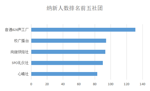 纳新人数排名前五的社团是音遇626声工厂、校广播台、尚甜烘焙社、SPO礼仪社、心晴社。