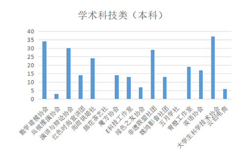 学术科技类本科纳新人数260人,占学术科技类社团纳新人数的35%。排名前三最受本科生欢迎的学术类社团是大学生科学技术协会、数学建模协会、演讲与辩论协会。