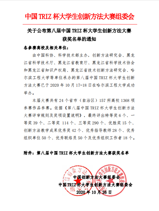第八届中国TRIZ杯大学生创新方法大赛获奖名单