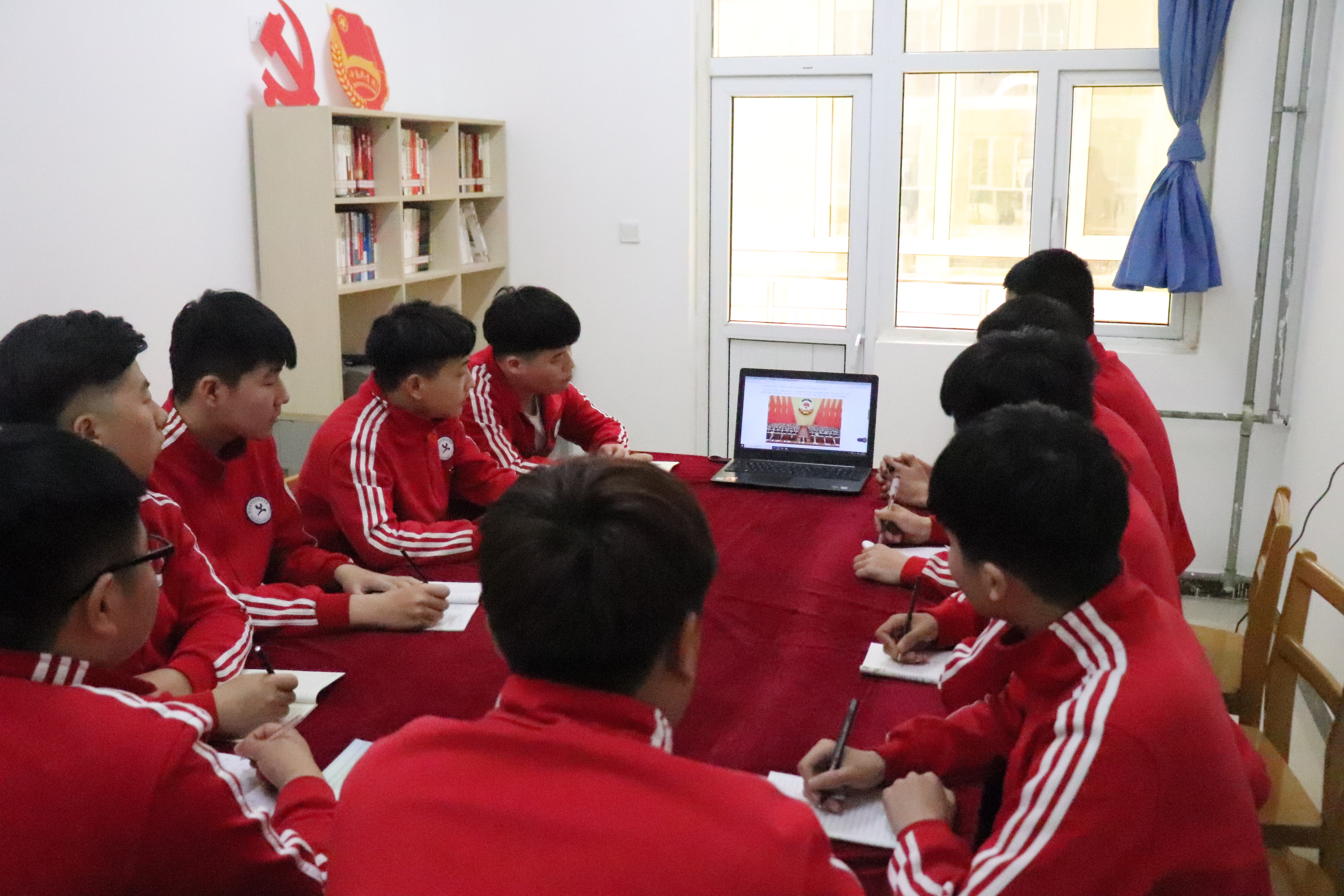 为深入学习党的十九大精神、贯彻落实习近平新时代中国特色社会主义思想,增强学生党员的党员意识,以实际行动彰显党员先锋模范带头作用。自2018年11月29日在明德书院举行教工党支部向学生党支部授书仪式之后,汽车工程系学生党支部就此正式入驻学生公寓,后续学生党支部活动、党建带团建都将在学生公寓党团活动室进行。为了更好的学习贯彻两会精神,于2019年3月15日中午在明德书院党团活动室进行两会精神的学习。涉入浩瀚的书院之海,明德书院的每一个人在书海中同心共筑,一起向着崭新的明天出发,书写明德书院的又一个传奇。